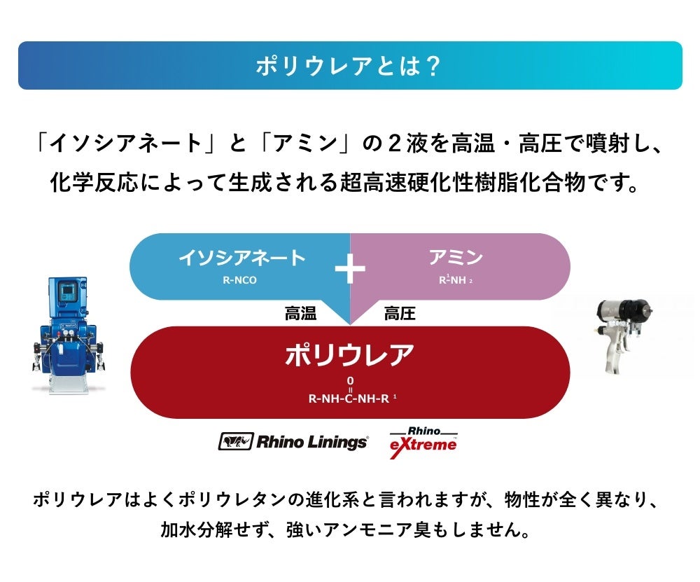 ポリウレアとは、イソシアネートとポリアミンの化学反応で生成されるウレア結合を基本とした樹脂化合物です。 防水性、耐薬品性、耐摩耗性、耐熱性、防食性に非常に高い能力を発揮する、様々な用途で対象物の強度を劇的に高めるライニング材です。